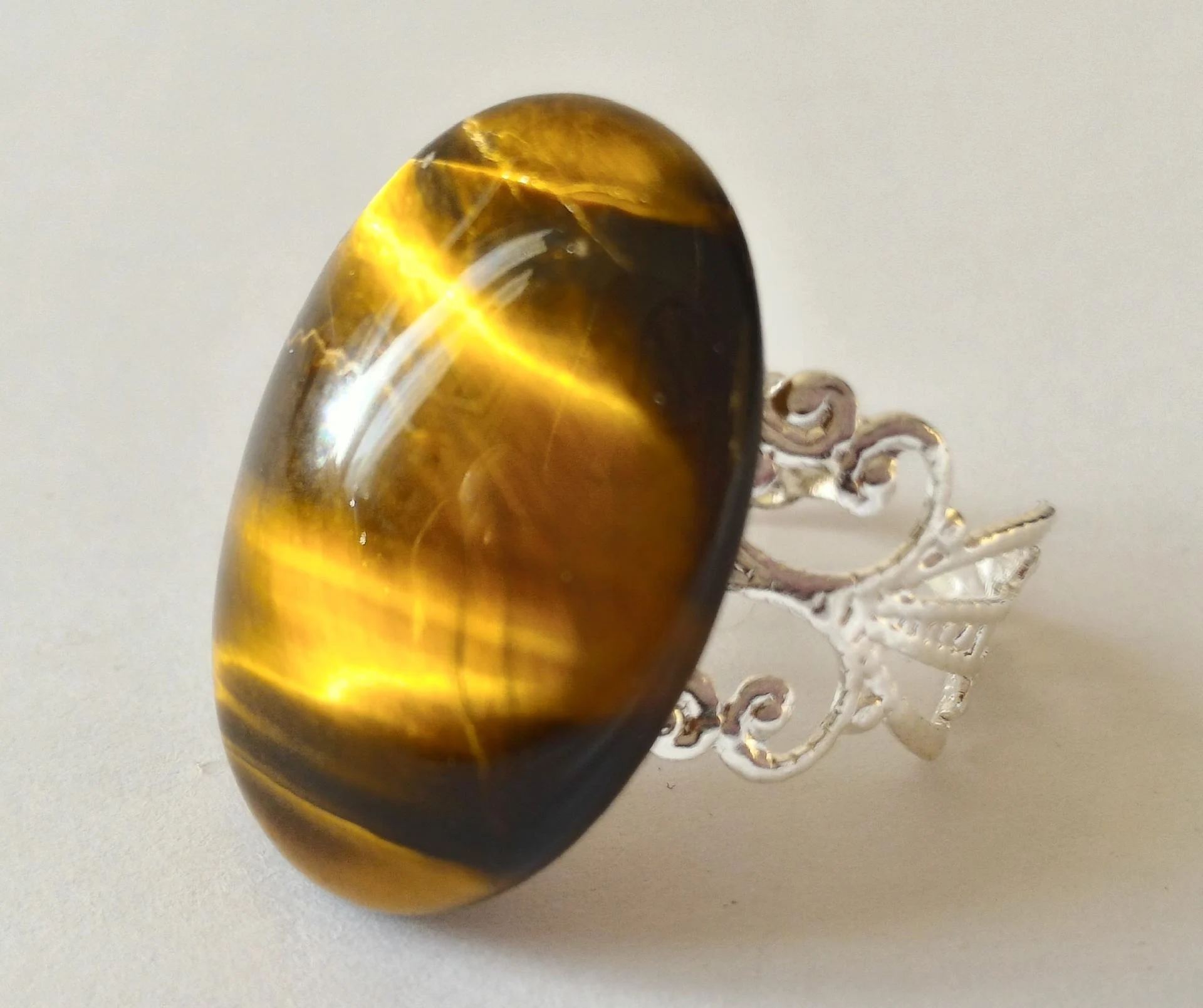 Bague Œil de tigre naturel,anneau réglable 19mm en alliage.
